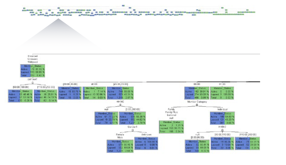 Membership data alone didn’t reveal the hidden truth. Our team enhanced their renewal file with our consumer data before constructing a series of decision trees seeking to uncover the secret.